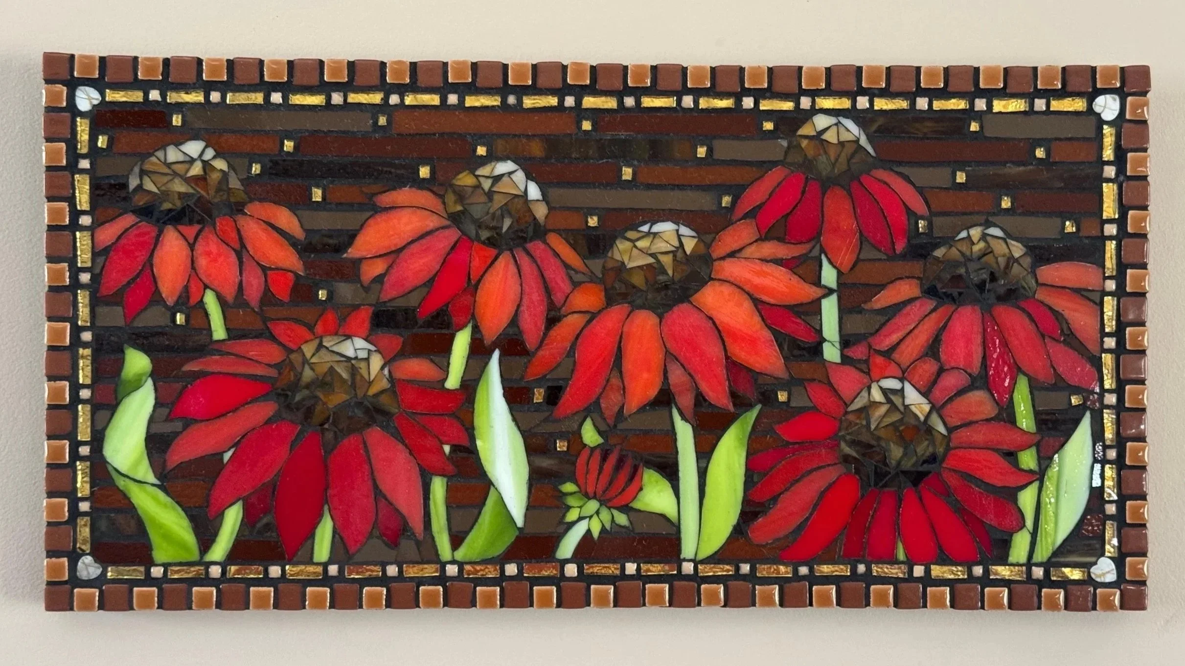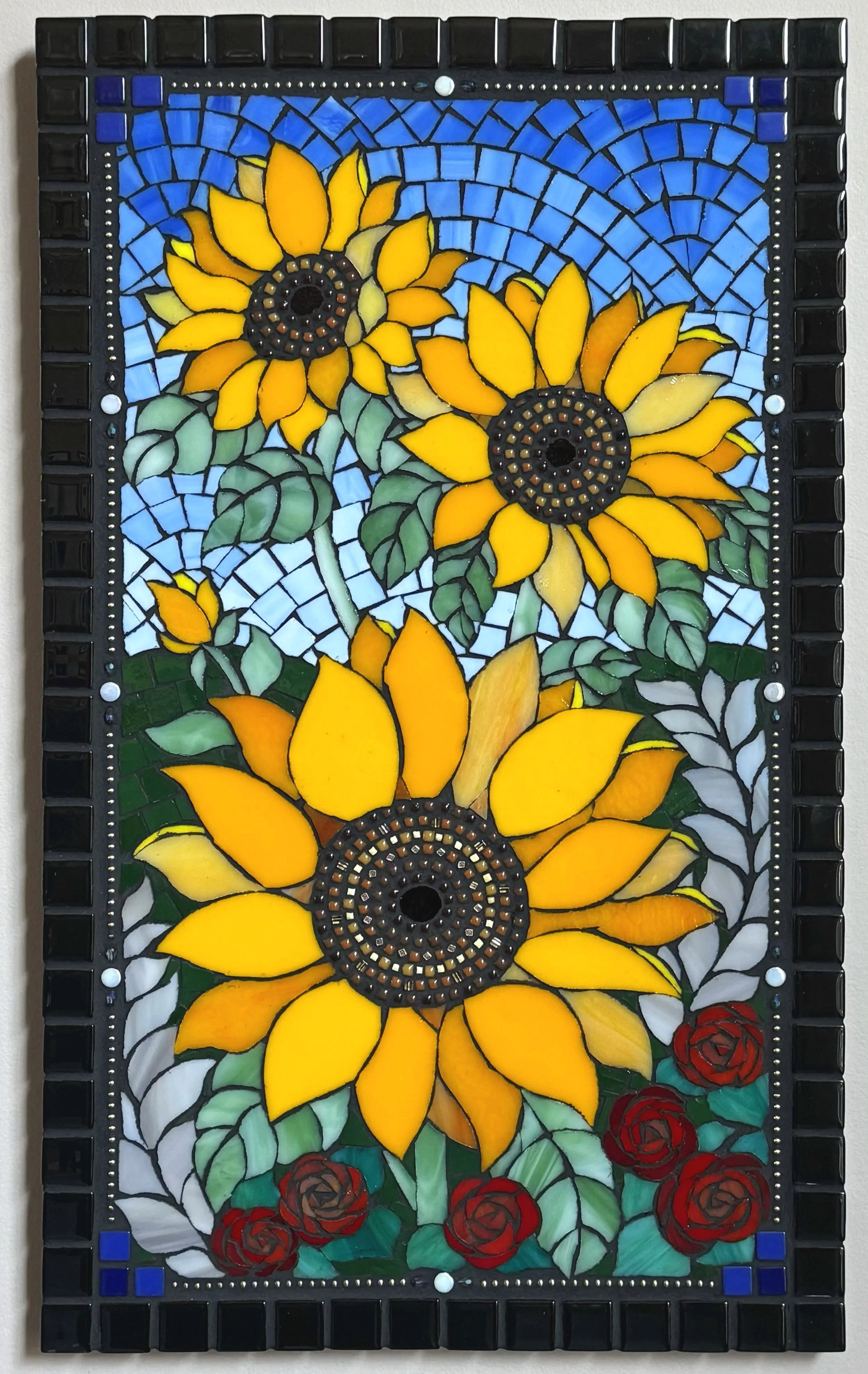 Original mosaic designs created with mixed tessera including hand cut stained glass, ceramic and glass tiles, stone, beads, rhinestones, ball-chain, and other findings.